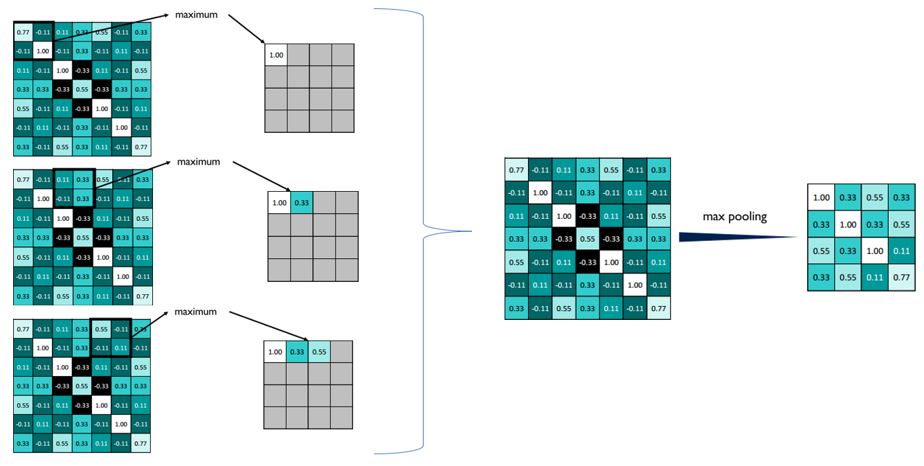 만들어진 Activation Map에 4개의 노드로 하나의 묶음을 만들어 Poling과정을 거칩니다. 4개의 노드 중 가장 큰 노드의 수치를 저장하는 Max Pooling과정입니다. 이 과정을 거쳐 가까운 픽셀간의 약간의 차이는 무시하게 됩니다.