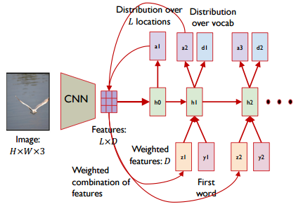 이제 CNN 층에서 FC층을 만들지 않고, 3*3*512의 Conv층에서 연산을 마무리 짓는다고 생각해보겠습니다. 3*3의 Features는 이미지를 3*3으로 나누었을 때 각 부분을 의미한다고 생각할 수 있습니다. 이 과정에서 모델은 이제 Weighted Features을 활용하게 됩니다. 각 단어를 예측할 때 9개의 구역으로 나눈 이미지에 가중값을 두어 예측하게 됩니다. 예를 들어, Bird라는 단어를 예측할 때는 그림 가운데 새 부분에 가중값이 높고, Sea를 예측할 때는 그림의 새 부분을 제외한 나머지 부분의 가중값이 높은 형태로 연산이 진행됩니다.