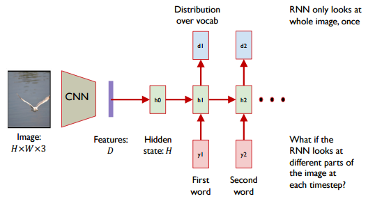 하나의 이미지를 글로 표현하는 것을 Image Captioning이라고 합니다. One-to-many의 가장 일반적인 예시이며 널리 사용되고 있는 방식입니다. CNN과 RNN을 사용하여 Image를 설명하는 하나의 문장을 만들어 보고자 합니다. 먼저 H*W*3의 이미지가 Input data로 들어옵니다. 이미지는 VGGNet 등의 기법을 사용하여 Features dimension을 만듭니다. RNN층을 통과시켜 이미지를 설명하는 word로 값을 반환하게 됩니다. 하지만 Features dimension이 그림 전체를 설명하고 있기 때문에 그림 전체의 이미지를 한번만 학습하게 됩니다.