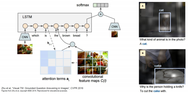 Visual Question Answering 문제에서 Attention을 어떻게 사용하는가에 대해 살펴보겠습니다. 이미지와 문장을 Input 데이터로 받습니다. CNN을 통해 이미지를 \(a_t\)의 Features를 받고, Attention Map과 함께 답을 도출합니다. 예를 들어, brown이라는 단어를 받았다면 이에 관련된 feature에 가중값을 Attention Map으로 만들어 \(C(I)\)와 결합하여 LSTM 모델에 넘겨주게 됩니다. 마지막 Attention Map 그리고 우측 CNN과의 Attention을 수행하여 이미지에서 어디를 봐야하는가에 대한 답을 찾습니다.