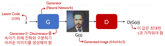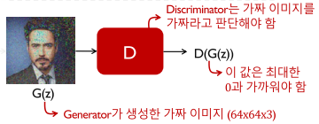 또한 동일한 Discriminator 신경망은 D(G(z))가 최대한 0에 가깝게 파라미터를 조정합니다. 이 때 G(z)는 Generator가 만든 가짜 이미지입니다.