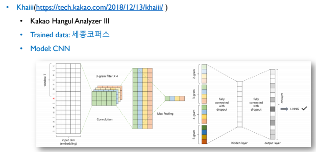 앞서 살펴본 KoNLPy가 규칙기반이라면, Khaiii는 데이터 기반으로 학습하여 만들어졌습니다. 특정 단어에서 Window size만큼 단어를 찾아 (1+2*window size, embedding size)가 입력으로 주어집니다. n-gram filter를 사용하여 벡터를 만들고, Max Pooling하여 가장 큰 스칼라를 찾습니다. 2, 3, 4, 5-gram으로 만든 벡터를 Fully connected하여 형태소를 분석 했습니다. Khaiii의 Base Window크기는 2, Embedding크기는 30으로 사용되었습니다.