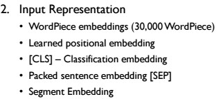 BERT모델에서 입력 데이터에 대한 설명입니다. WordPiece embeddings(tokenizer)은 단어를 Charater Level부터 Subword Level까지 통계적 기법을 통해 사전(Dictionary)을 구축하는 알고리즘입니다. BERT는 WordPiece를 통해 30,000개의 토큰 종류를 구축하여 사용합니다.