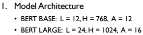 BERT의 모델 아키텍처입니다. BERT는 Transformer의 Encoder를 사용하여 구성되었습니다. 따라서 기존의 Transformer와 거의 유사합니다. L은 Transformer의 개수를 의미하고 H는 Hidden state의 차원을 의미합니다. A는 Multi-head Attention의 개수를 의미합니다. 즉, BERT BASE는 12개의 Transformer, 768개의 Hidden state 차원, 12개의 Multi-Head Attention을 사용합니다.