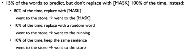 15%의 확률로 마스킹된 단어를 모두 [MASK]토큰으로 사용하지는 않습니다. 그 중 80%만을 [MASK]토큰으로 변경합니다. 10%는 완전히 다른 의미를 갖는 단어로 변경하고, 나머지 10%의 단어는 그대로 사용합니다.