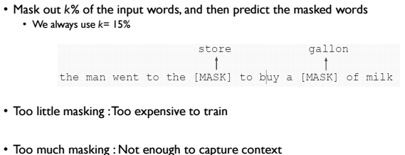 MLM은 입력 문장에서 각 단어를 K%의 확률로 마스킹하는데, 논문에서는 15%의 확률을 사용합니다. 만약 마스킹이 너무 적다면 학습 효율이 떨어지고, 너무 많다면 문장의 맥락을 파악하기 힘들어 학습이 어려워집니다.