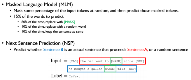 BERT모델을 학습하는 방법은 Masked Language Model(MLM)과 Next Sentence Prediction(NSP)입니다. MLM은 특정 확률로 마스킹된 단어를 예측하여 학습하는 방법이고, NSP는 두 개의 문장이 실제로 연결된 문장인지를 예측하여 학습하는 방법입니다.