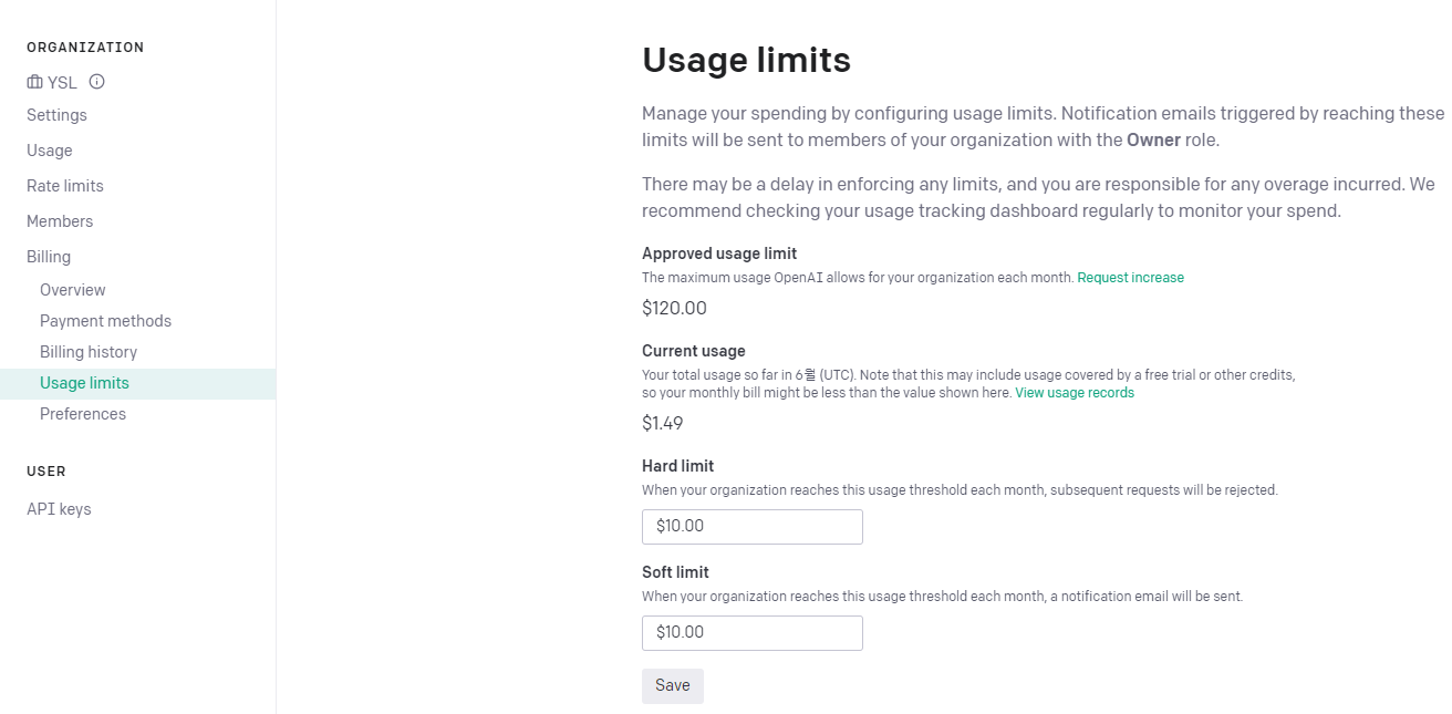 ** Soft limit은 사용량이 지정한 limit에 도달하면 메일로 경고문을 보내는 기능이고, Hard limit은 사용량이 지정한 limit에 도달하면 이후 API요청을 거절하는 기능입니다.