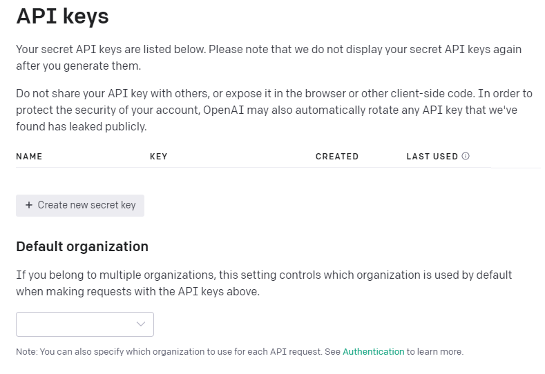 6. Create new secret key를 클릭합니다.