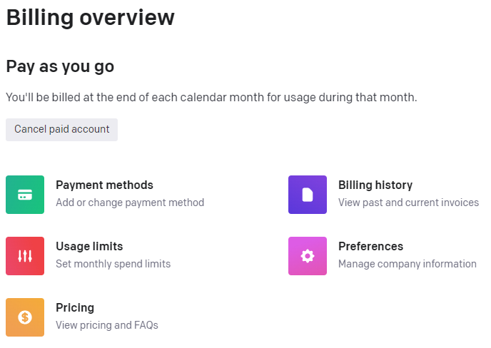 9. 앞으로 사용하게 될 API KEY는 지금 만든 secret key입니다. 처음 아이디를 생성하면 5$의 크레딧이 제공됩니다. 하지만 아이디를 생성한지 오래 되었다면(3달 이상), 이미 크레딧은 종료되었을 것입니다. 이 때 API KEY를 사용하기 위해서는 결제정보를 입력해야 합니다. 화면 좌측에 Billing을 클릭합니다.
