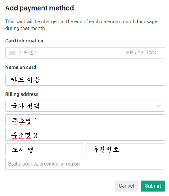 11. 결제 정보는 다음과 같습니다. 주소명 1, 주소명 2에는 도로명주소와 지번 주소를 입력하시면 됩니다. 나머지 정보도 알맞게 입력 후 Submit을 클릭하면 Payment methods에 카드가 등록됩니다.