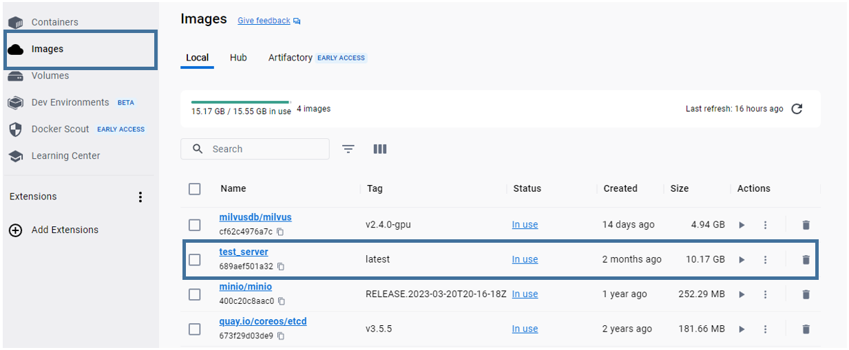 docker container 생성이 완료되었다는 메세지가 나타나면, docker desktop 혹은 docker images 명령어를 통해 docker image 생성 여부를 확인해주세요.