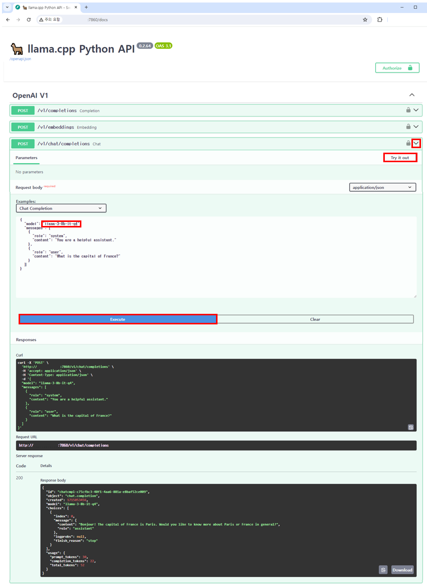 마지막으로 fastapi swagger를 통해 API 테스트를 진행합니다. llamacpp API는 swagger를 지원하며, 이를 통해 API를 손쉽게 테스트할 수 있습니다. "http://127.0.0.1:port/docs"로 접속하여 swagger를 열 수 있습니다. 이 때, port는 이전에 설정한 API 포트 번호로 변경합니다.